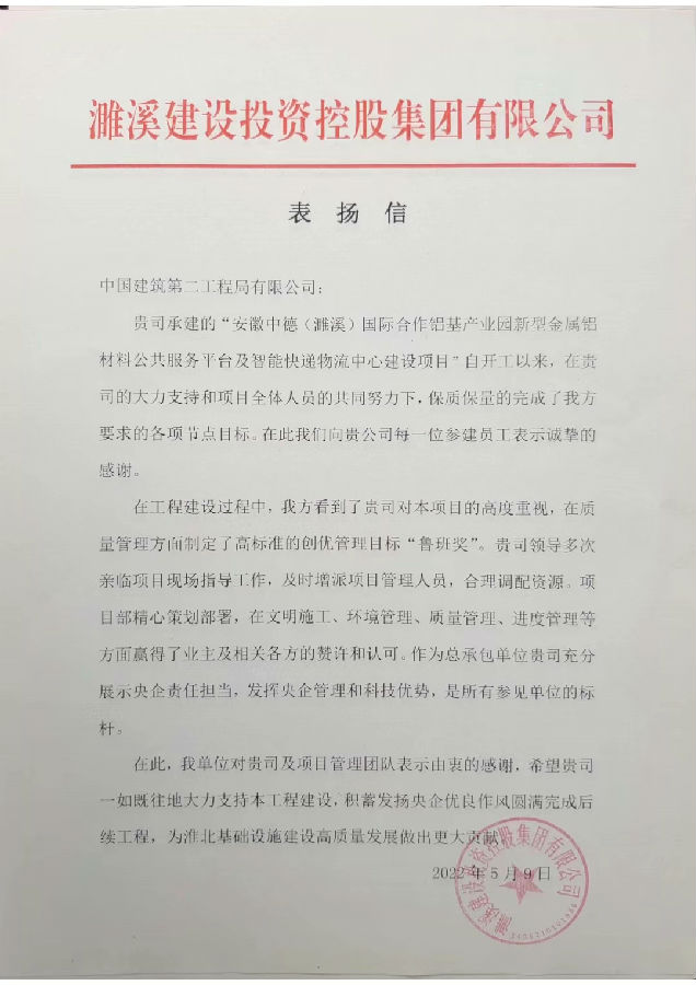 近日,公司安徽分公司濉溪中德產(chǎn)業(yè)園項目收到安徽省濉溪經(jīng)濟開發(fā)區(qū)管理委員會和濉溪縣建設開發(fā)有限公司發(fā)來的表揚信,對項目在文明施工、環(huán)境管理、質(zhì)量管理、進度管理等方面的工作表示充分的認可。