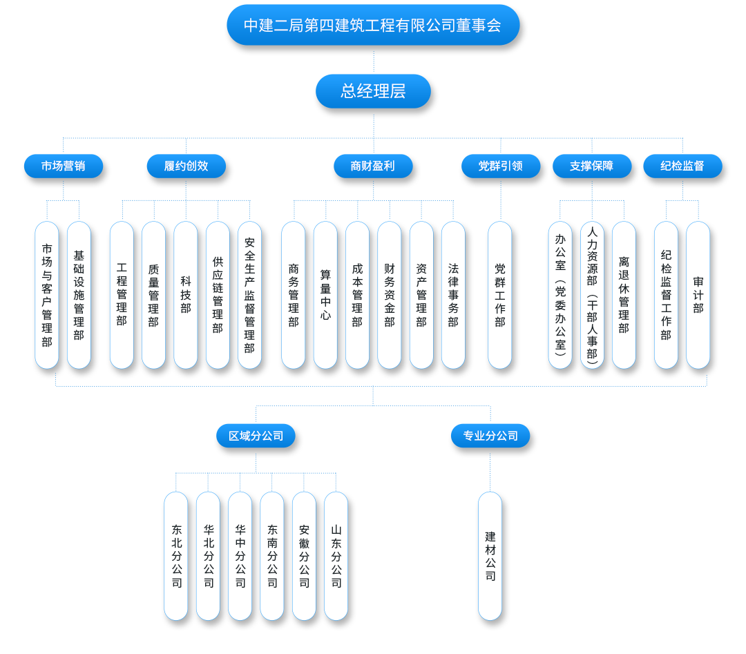 戰略引領、把舵定向,六大體系協同聯動,涵蓋19個職能部門,全力助推公司管理轉型升級。為政府、社會、客戶提供卓越的建筑全產業鏈解決方案。